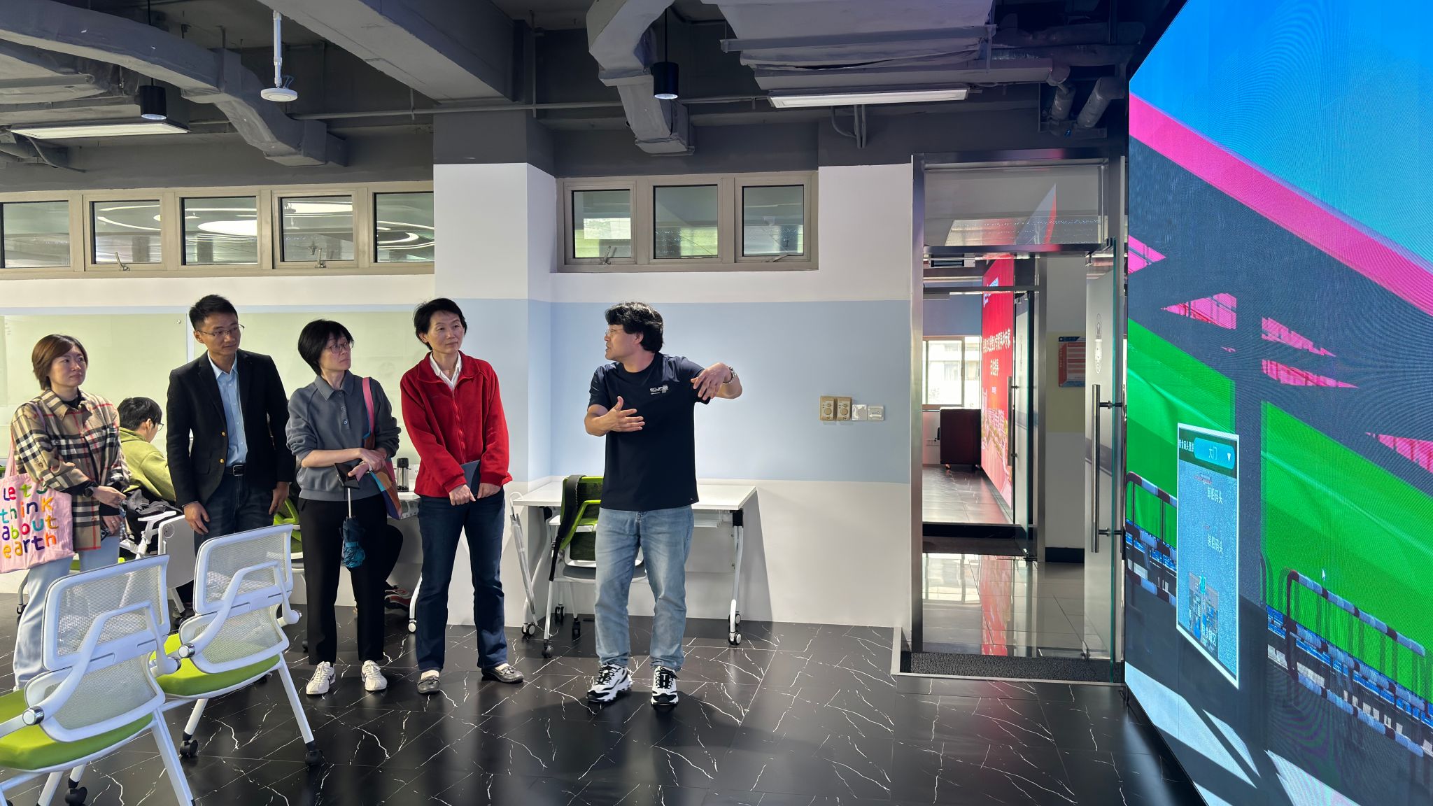 在虚拟仿真LBE大空间体验教学实验室,随行的三位同事沉浸式体验了LBE大空间项目,对其技术实现和互动效果表现出浓厚兴趣。双方进一步探讨了此类技术在卫生行业——如医学模拟训练、健康宣教等场景中推广应用的可能性,并就未来跨领域合作交换了意见。
