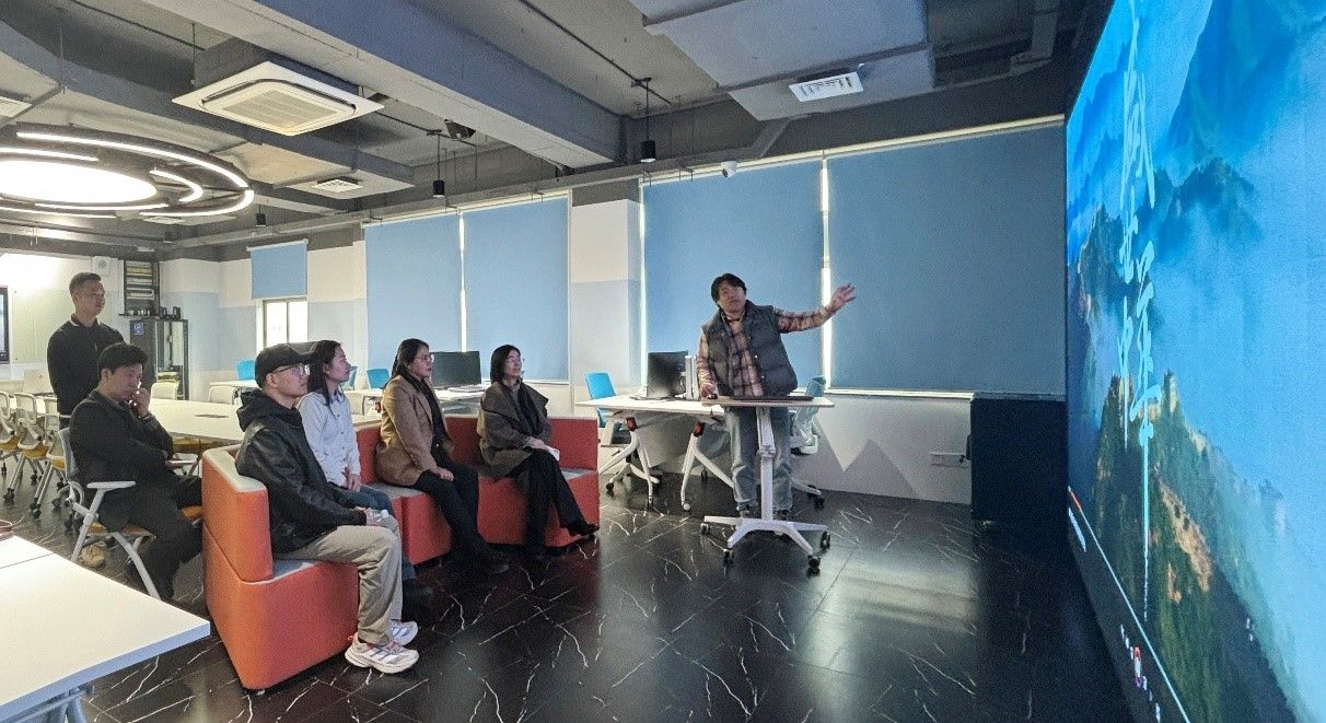 双方围绕虚拟仿真技术在建筑可视化、艺术设计教学、跨学科实践平台建设以及数智化教学等议题进行了探讨。陈章进主任向来宾介绍了虚拟仿真实验中心的整体发展思路与技术架构,重点分享了中心在支持“设计+科技”“空间+交互”等跨学科教学场景中的探索与实践。单子鹏老师系统介绍了虚仿实验平台对校内相关课程的支撑,展示了学生课堂学习成果,充分体现了虚实融合教学环境在提升设计教育体验与效率方面的显著优势。